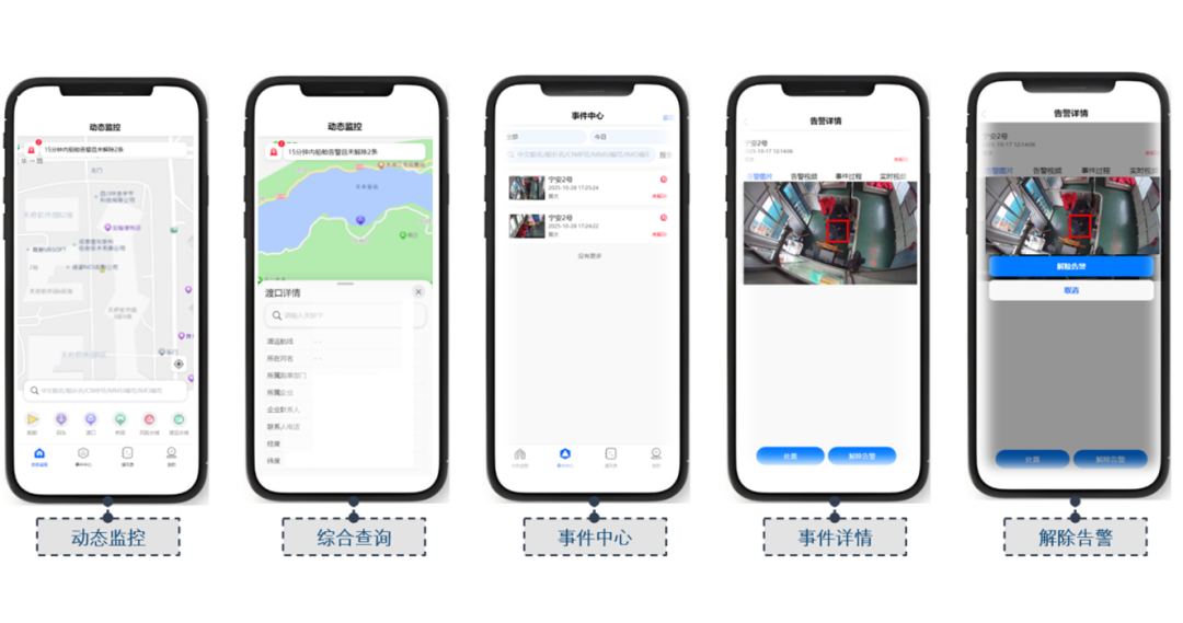 移动应用:支持手机实时动态监测船舶,查看渡口、码头等交通要素信息,以及对告警事件进行接收与处置。
