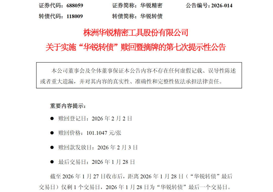 1月27日,华锐精密发布关于实施“华锐转债”赎回暨摘牌的第七次提示性公告,提醒投资者1月28日为华锐转债最后一个交易日,2月2日是最后一个转股日,债券持有人应及时卖出或转股。2月2日收市后,未实施转股的华锐转债将全部冻结,停止交易和转股。