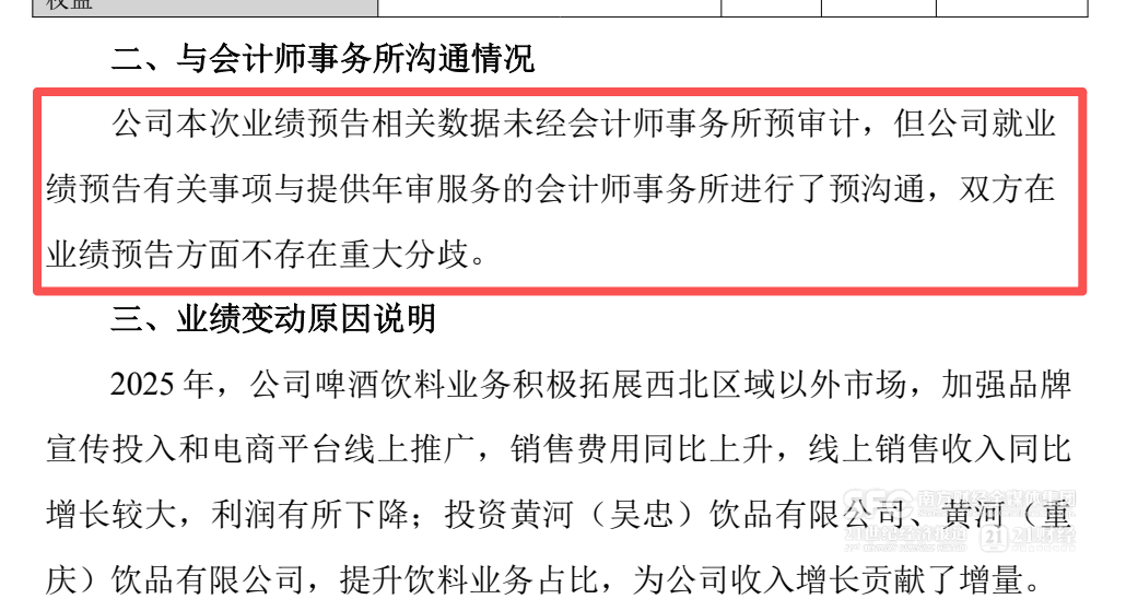“2025年,公司啤酒饮料业务积极拓展西北区域以外市场,加强品牌宣传投入和电商平台线上推广,销售费用同比上升,线上销售收入同比增长较大,利润有所下降;投资黄河(吴忠)饮品有限公司、黄河(重庆)饮品有限公司,提升饮料业务占比,为公司收入增长贡献了增量。”业绩预告总结。