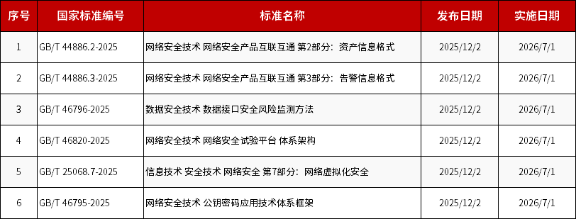 近日,国家市场监督管理总局、国家标准化管理委员会发布2025年第32号、33号《中华人民共和国国家标准公告》,11项网络安全国家标准获批发布。天融信(002212)参与了其中6项国家标准的研制,涉及网络安全产品互联互通、数据接口安全、网络靶场、网络虚拟化安全和密码技术等多个领域。