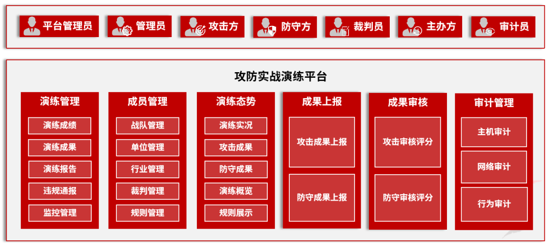 为满足网络安全靶场的建设要求,天融信研发了攻防实战演练系统,围绕攻防演练活动的前、中、后三个阶段,为攻击方、防守方和裁判方等各类角色提供综合演练工作平台,以实现攻防演练成果评判流程化和进程可视化。