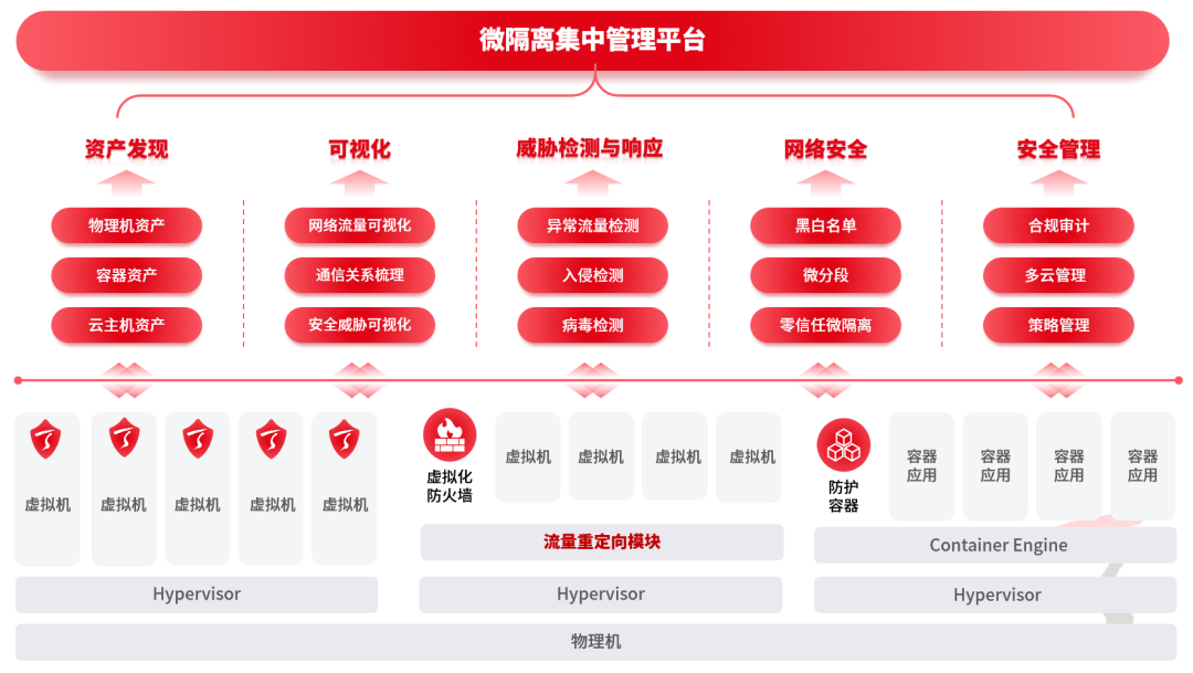 针对混合云与虚拟化环境下东西向流量不可见、内部威胁难防范、策略管理粒度粗放等安全痛点,天融信应用网络虚拟化安全技术研发了微隔离管理平台,以“零信任,微隔离”为核心构建体系化解决方案。平台全面兼容飞腾、麒麟等国产化软硬件环境,创新采用有代理与无代理混合部署模式,可灵活适配高并发、流量复杂的网络场景,实现对物理机、虚拟机、云主机、容器及混合环境的细粒度访问控制。