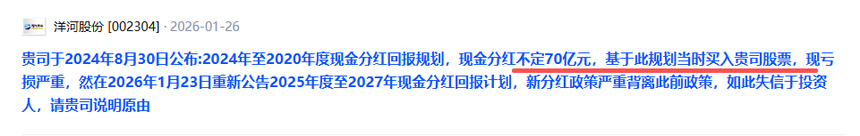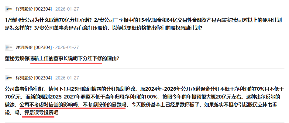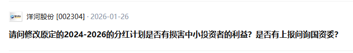 截至2025年末,洋河股份股东户数达16万户,其中不乏因高股息预期而重仓配置的长期投资者。如今,分红“保险”被单方面撤回,不少投资者在互动平台直言:为什么可以随意修改此前对投资者作出的分红承诺、承诺才一年就撕毁契约公司诚信何在?