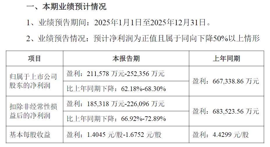 进入2025年,形势更为严峻。据公司最新业绩预告,2025年归母净利润预计仅为21.16亿至25.24亿元,同比大幅下降62.18%–68.30%。若继续履行70亿元保底分红,不仅需分光全年利润,还需额外填补至少45亿元缺口。