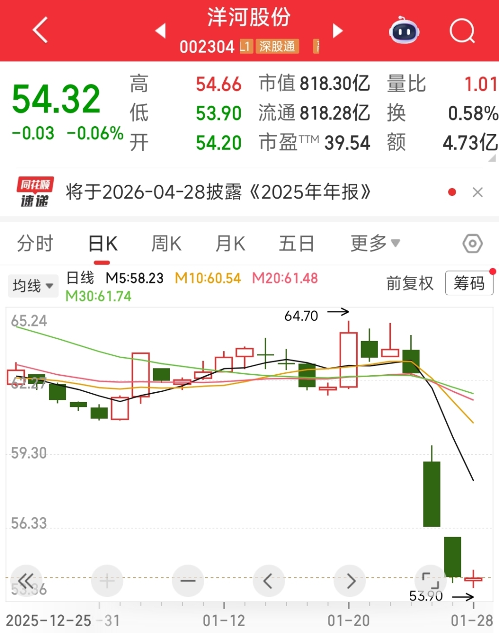资本市场的反应迅速而剧烈。1月26日,新规划公告后首个交易日,洋河股份股价暴跌9.85%,单日市值蒸发约92.77亿元。截至1月28日午间休盘,股价已连续三日下跌,累计跌幅超过13%。
