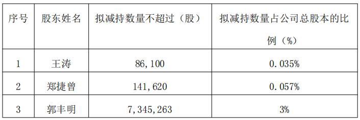 持有公司股份110,703,926股(占公司总股本比例45%)的控股股东郭丰明,计划在公告发布之日起15个交易日后的3个月内通过集中竞价交易和大宗交易方式减持其所持有的公司股份合计不超过7,345,263股(即不超过公司总股本的3%)。