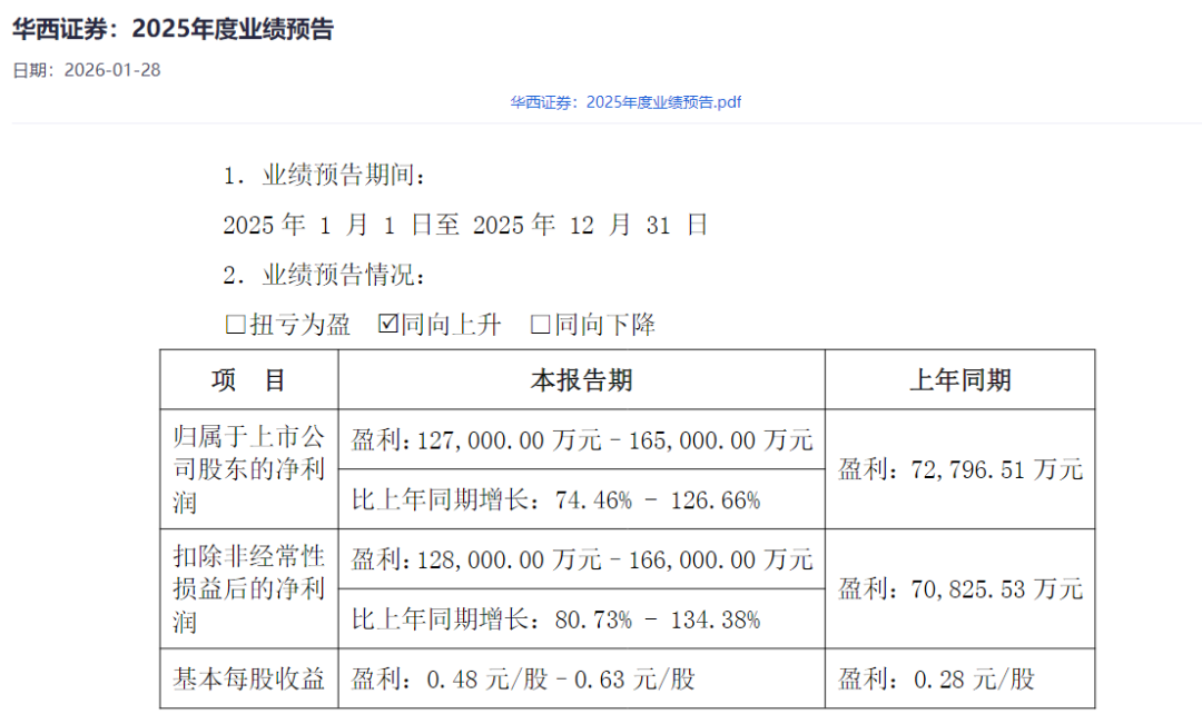 华西证券2025年业绩预告