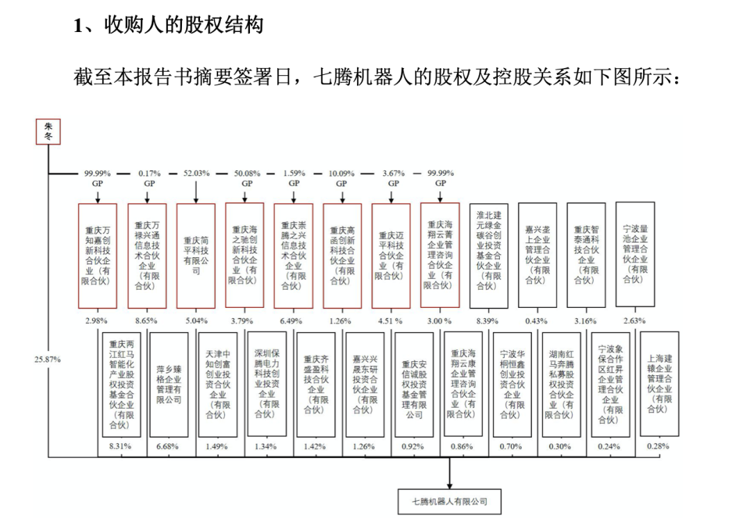 本次要约收购完成后,七腾机器人及其一致行动人最多合计持有胜通能源44.99%的股份及对应的表决权。上市公司控股股东变更为“七腾机器人”,实际控制人变更为朱冬。