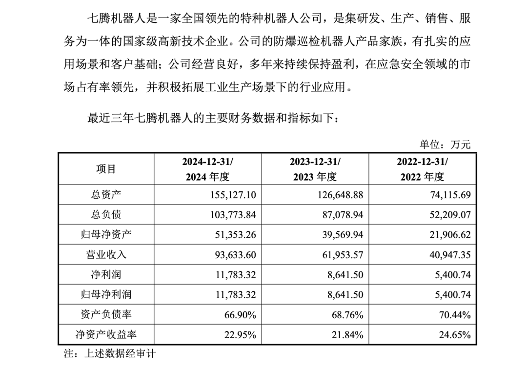 财务方面,七腾机器人经营良好,多年来持续保持盈利,其中2024年实现营业收入9.36亿元,净利润达1.18亿元。