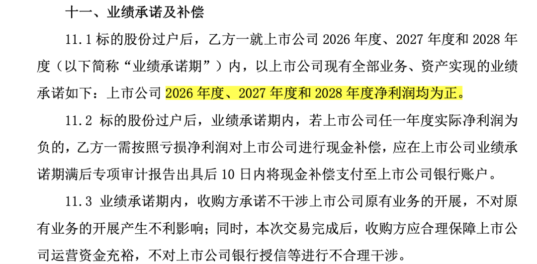 值得关注的是,此次交易设置有业绩承诺及补偿,转让方承诺,上市公司2026年度、2027年度和2028年度净利润均为正。
