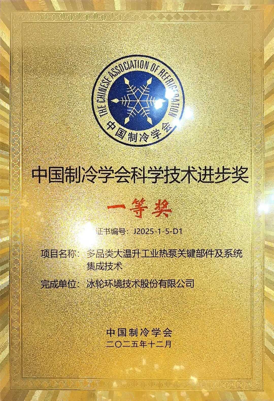 冰轮环境荣获2025年度中国制冷学会科学技术进步奖一等奖