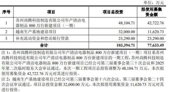 公司本次发行拟募集资金总额不超过77,633.49万元(含),扣除发行费用后的募集资金净额拟用于苏州尚腾科技制造有限公司年产清洁电器制品800万台新建项目(一期)、越南生产基地建设项目、补充流动资金和偿还银行贷款。