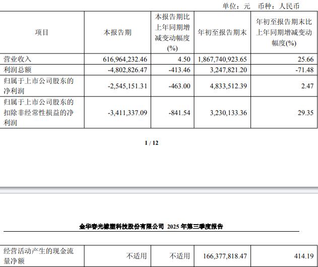 据公司2025年第三季度报告,本报告期,公司实现营业收入6.17亿元,同比增长4.50%;归属于上市公司股东的净利润-254.52万元;扣除非经常性损益后的净利润-341.13万元。
