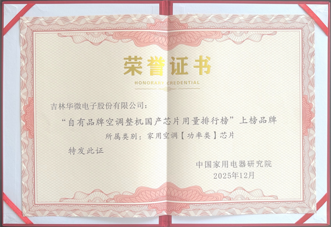 12月9—11日,华微电子受邀参加中国家用电器研究院主办的2025中国家电科技年会,凭借在家电核心控制领域的持续深耕,荣登功率类“自有品牌空调整机国产芯片用量排行榜”,获得权威认证证书。