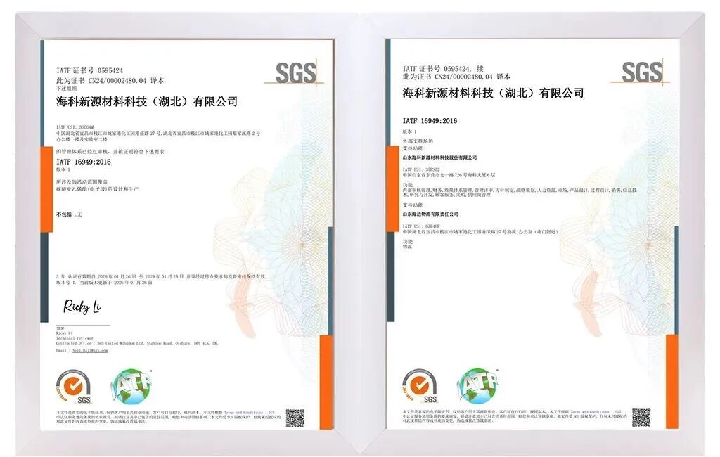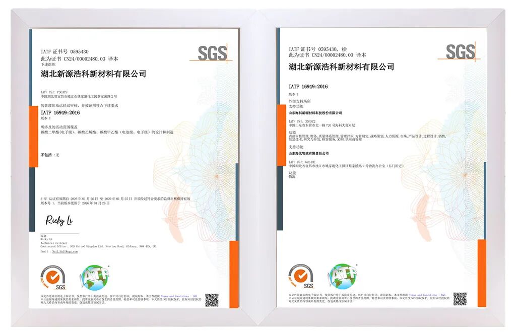 近日,海科新源(301292)下属子公司海科新源材料科技(湖北)有限公司、湖北新源浩科新材料有限公司的锂电池材料电解液溶剂与添加剂正式获得SGS机构颁发的“IATF16949:2016汽车行业质量管理体系”认证证书,该证书的获取不仅标志着海科新源湖北基地的质量管理体系迈上新台阶,为公司产品在汽车领域深耕提供了强大助力,进一步提升了公司的品牌影响力,更是对公司践行“以客户为导向、以质量为核心”理念的肯定。未来,公司将秉承高标准业务流程管理,深化体系落地,推动质量管控与技术创新深度融合,为客户持续提供更可靠、更高效的汽车产品及服务。