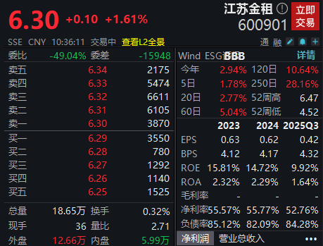 截至发稿,江苏金租股价上涨1.61%,报6.30元/股,市值364亿元。