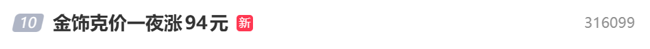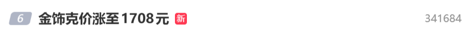 品牌金饰价格水涨船高,“金饰克价涨至1708元”“金饰克价一夜涨94元”等词条登上微博热搜榜。