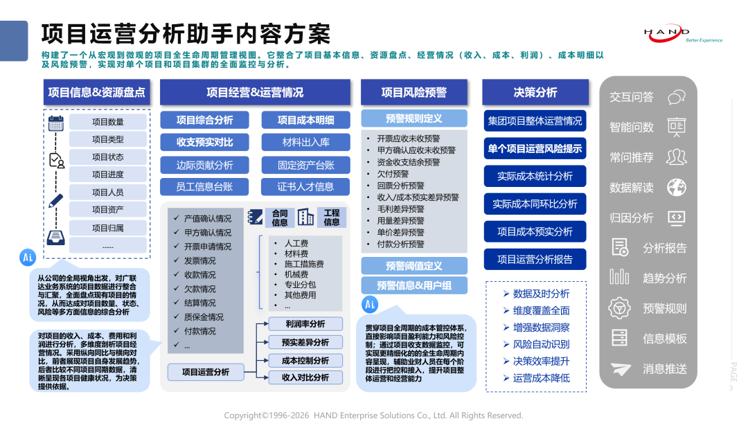 这三大助手的推出,标志着智能决策平台从“内部运营优化”向“内外协同决策”的跨越,形成覆盖“行业对标—项目管控—经营分析”的完整决策支持体系。