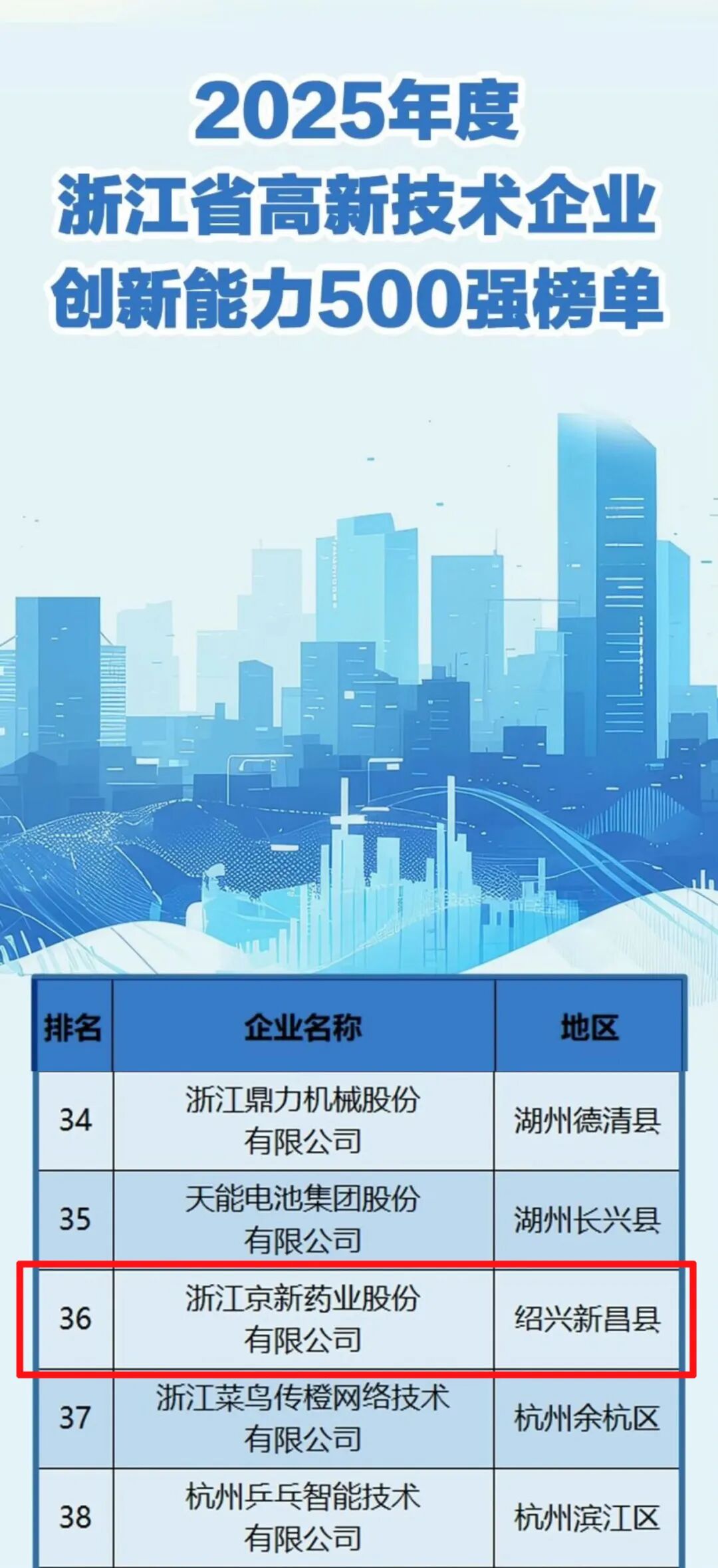 第36位!京新药业荣登浙江省高新技术企业创新能力500强