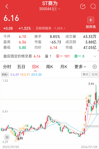 值得注意的是,自2026年1月8日,也就是ST赛为发布招募重整投资人公告的当天,公司股价开始连续多日大涨。截至1月28日收盘,ST赛为股价收报6.16元/股,最新市值约47亿元,相较1月7日收盘价,累计涨幅达54%。