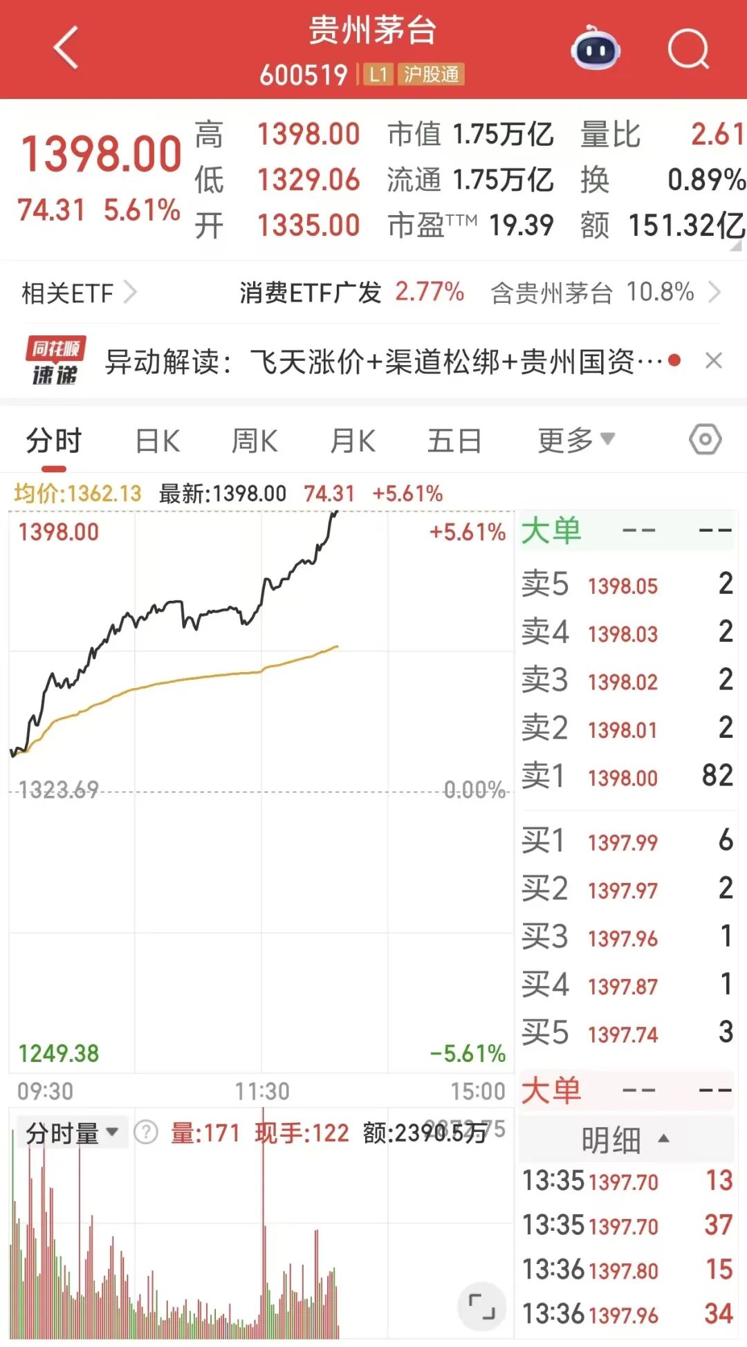 1月29日,贵州茅台(600519)涨幅扩大至5.61%,现报1398.00元。
