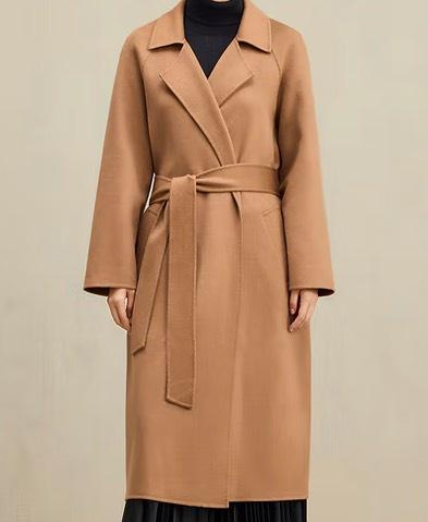 在现代都市风格的办公室里,镜头聚焦在一位身穿羊毛大衣的模特身上,她轻轻地整理领子,系好腰带。阳光照亮了大衣,增添了几分温暖和优雅。