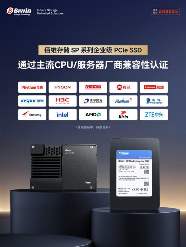 SSD 系列产品已通过 Intel、AMD、鲲鹏、飞腾、龙芯、兆芯等主流 CPU 平台的适配认证,以及联想、新华三、浪潮、中科曙光(603019)等头部服务器厂商的兼容性认证;