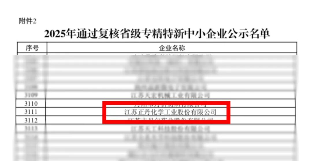 近日,江苏正丹化学工业股份有限公司凭借在技术创新、产业链深耕、绿色发展等领域的突出表现,成功通过 2025 年度省级专精特新中小企业复核。这一认证既是对企业多年来坚持 “专业化、精细化、特色化、新颖化” 发展道路的肯定,更是对其行业引领实力的再次印证。