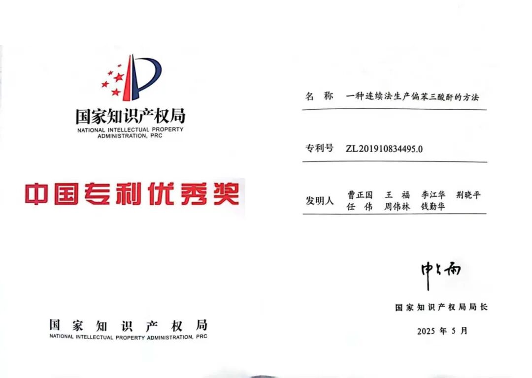 创新是专精特新企业的核心底色。多年来公司坚持以科技创新为导向,不断提升创新能力和研发水平,通过研发活动掌握了多项核心技术与核心生产工艺,在关键领域拥有核心自主知识产权,成为了同行业领跑者。目前累计拥有授权专利52件,其中发明专利 32件,实用新型专利20件。公司连续多次被认定为“高新技术企业”,是江苏省专精特新企业、国家知识产权示范企业、中国石油和化工行业知识产权示范企业,获批设立了“江苏省研究生工作站”、“江苏省博士后创新实践基地”,公司工程研究中心被认定为省级工程技术研究中心和省级企业技术中心,2025 年 6 月,公司发明专利“一种连续法生产偏苯三酸酐的方法(ZL201910834495.0)”荣获第二十五届中国专利优秀奖。