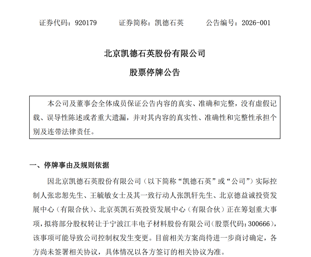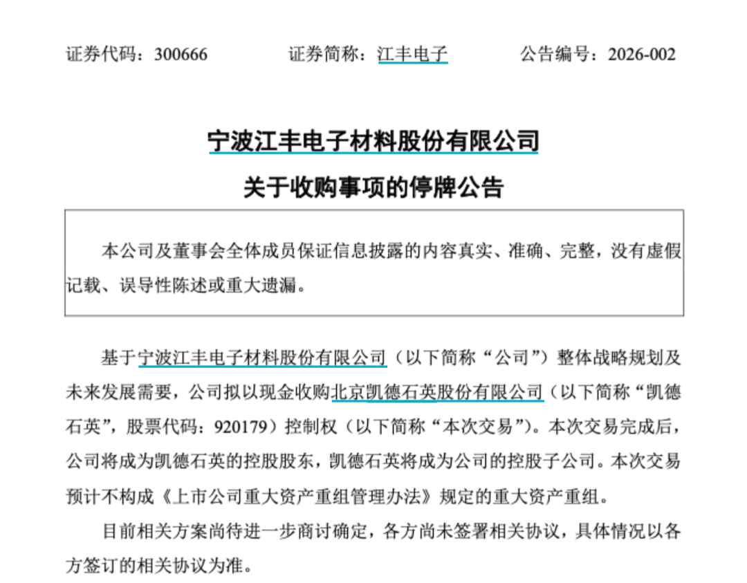 1月29日,半导体材料领域两家上市公司——深交所创业板公司江丰电子(300666)(300666)与北交所公司凯德石英(920179)同步发布公告,宣布将于1月30日开市起停牌。
