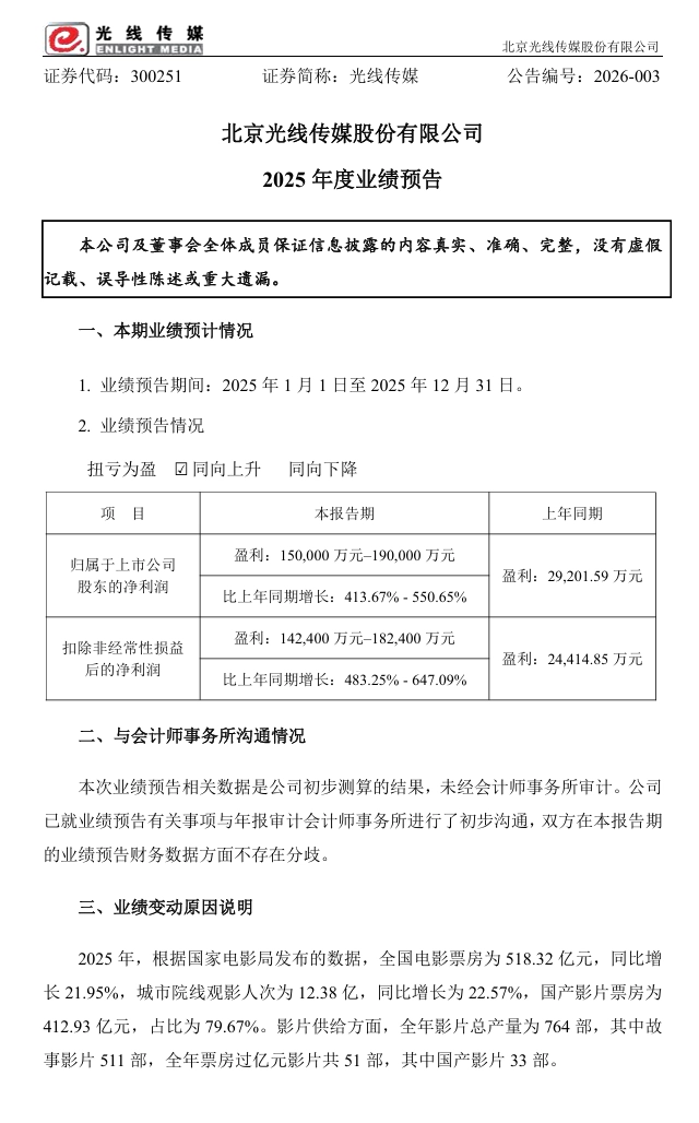光线传媒 2025 年净利润预增超 4 倍,《哪吒 2》及 IP 运营贡献显著