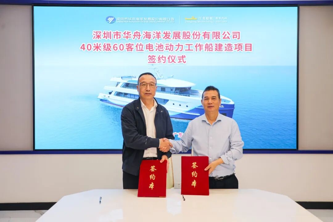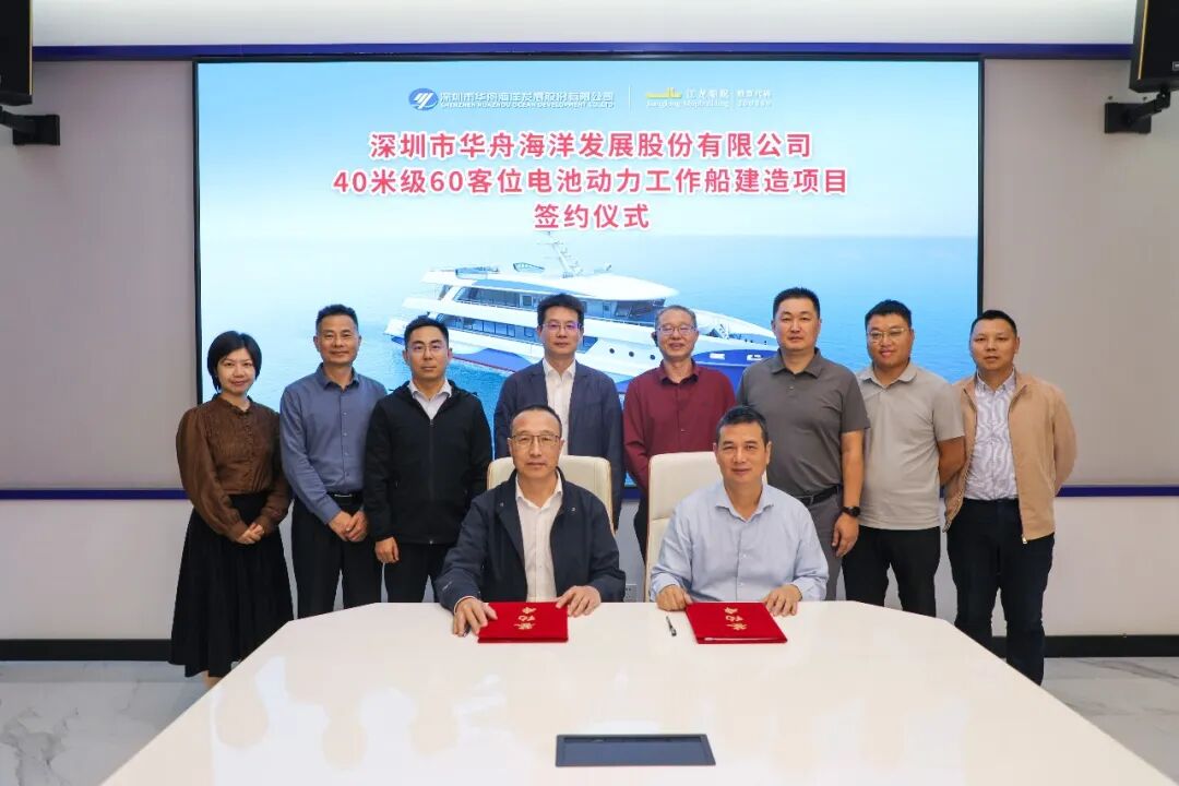 12月12日,江龙船艇(300589)(股票代码:300589)成功签约深圳市华舟海洋发展股份有限公司40米级60客位电池动力工作船。这一合作不仅彰显了江龙船艇在新能源船舶领域的技术硬实力,更标志着国内沿海交通船绿色智能化升级迈出关键一步。深圳港集团有限公司董事会秘书刘剑、深圳市华舟海洋发展股份有限公司董事长韩劲柏、江龙船艇董事长晏志清、董事兼副总经理贺文军等出席签约仪式。