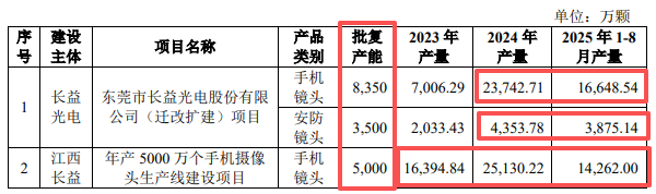 需要指出的是,在报告期(2023年、2024年及2025年前8个月)内,长益光电存在超环评批复产能生产的情形。具体来看,长益光电东莞迁改扩建项目的手机镜头环评批复产能为8350万颗,而该产品2024年、2025年前8个月的实际产量分别达2.37亿颗、1.66亿颗,其中2024年实际产量较批复产能超产184.34%;其全资子公司江西长益年产5000万个手机摄像头生产线建设项目,报告期内各期实际产量分别为1.64亿颗、2.51亿颗、1.43亿颗,均大幅超出5000万颗的环评批复产能。