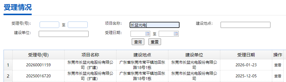 但截至2026年1月29日,东莞市生态环境局官网显示,长益光电相关环评事项仍处于受理阶段,尚未获得拟审批或正式审批结果。