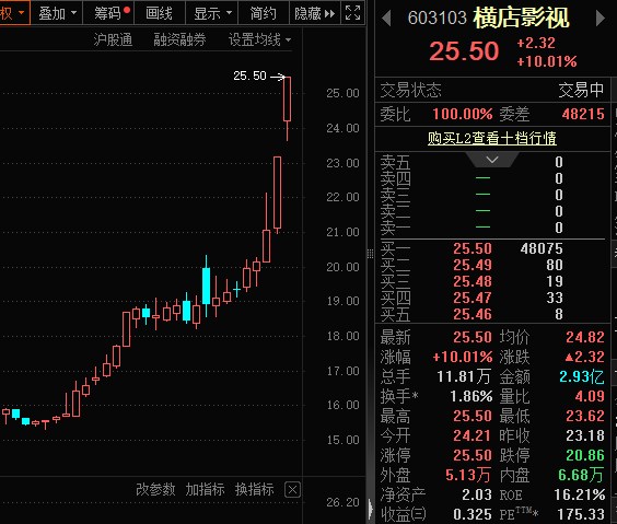 影视院线股连续强势,横店影视(603103)(603103)收获两连板,截至目前,公司投资出品的《熊出没·年年有熊》《飞驰人生3》《星河入梦》等影片已定档2026年春节档;幸福蓝海(300528)、光线传媒涨超10%,金逸影视(002905)、博纳影业(001330)等跟涨。