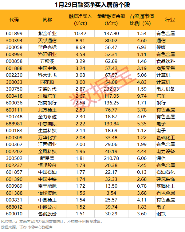 具体到个股,1月29日共有1614只股获融资净买入,净买入金额在1亿元以上的有52只,紫金矿业(601899)融资净买入额居首,当日净买入10.42亿元;其次是天孚通信(300394)、蓝色光标(300058),融资净买入金额分别为8.91亿元、8.69亿元;融资净买入金额居前的还有洛阳钼业(603993)、五粮液(000858)、中国中免(601888)等。
