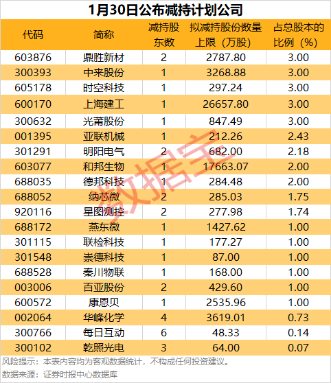 统计显示,1月30日共有20家公司披露股东减持计划,鼎胜新材(603876)、中来股份(300393)、时空科技(605178)等公司拟减持比例居前。