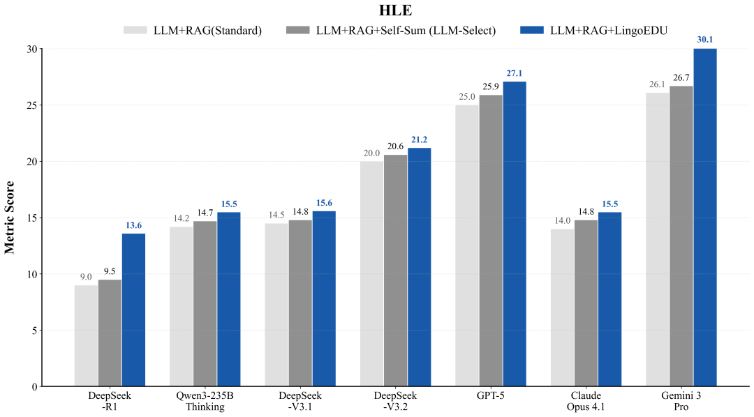 实验结果显示,LingoEDU在语义切分准确性、推理可靠性以及综合成本效率等方面,均显著优于现有主流方案。而且LingoEDU能够零成本适配所有大模型。在被称为“AGI终极试炼”的HLE(Humanity’s Last Exam)评测中,DeepSeek-R1在适配EDU技术后,准确率从9.0%提升至 13.6%,相对提升达51%。