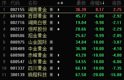 此前已连续四日“一字”涨停的湖南黄金(002155)(002155)早盘再度以涨停开盘,但临近午盘涨停板被打开,涨幅有所回落。截至发稿,该股上涨8.17%,尽管如此,其目前仍是今日贵金属板块中唯一上涨的个股。然而,更多个股被抛售潮席卷,白银有色(601212)、招金黄金(000506)、四川黄金(001337)、豫光金铅(600531)等多只前期热门股开盘即被巨量卖单封于“一字”跌停。