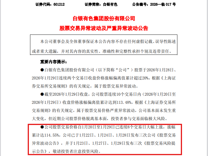 在此前股价“飙涨”期间,白银有色频繁发布股票交易异常波动及风险提示公告。昨日晚间,白银有色再次发布公告予以提醒。公告显示,公司股价自2026年1月20日至2026年1月29日已连续8个交易日大幅上涨,涨幅累计达114.55%。