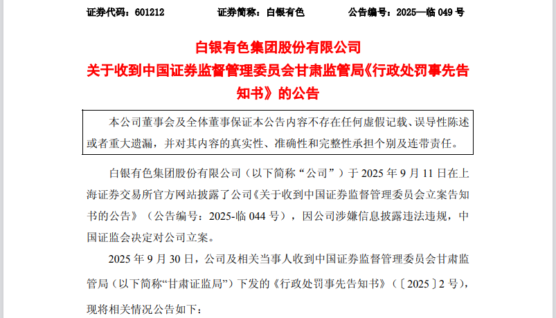 此外,其股价狂欢的背后,是公司信息披露的瑕疵。根据2025年10月1日公告,白银有色因在2019年至2023年年报中会计处理不谨慎,导致多年财务数据披露不准确;同时,因未在2019年至2024年年报中披露总计30亿元理财产品情况,导致相关年报存在重大遗漏,公司及相关责任人已因此收到警示函及《行政处罚事先告知书》。