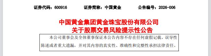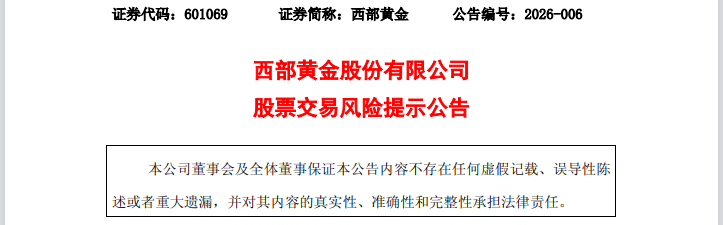 除白银有色外,昨日晚间,还有多只黄金概念股相继发布公告提示风险。中国黄金(600916)澄清公司未拥有探矿权、采矿权;招金黄金提示公司可能面临黄金价格波动、境外项目运营、矿山设施设备陈旧老化与技术落后导致产能受限等风险;西部黄金(601069)则直接呼吁投资者理性投资、审慎决策,注意投资风险。