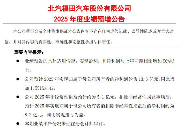 福田汽车表示,本次业绩预告数据尚未经注册会计师审计,具体财务数据将以正式披露的2025年年度报告为准。