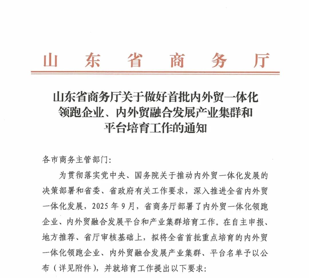该名单是山东省商务厅为贯彻落实国家及省委、省政府关于推进内外贸一体化的决策部署,于2025年9月启动培育评选工作,经过企业申报、地方推荐、综合评审等程序最终确定。省商务厅要求各地市及时总结推广入选企业和平台的典型经验,并择优向商务部推荐,争取在全国范围内进行宣传推广。