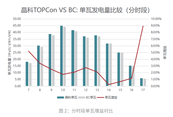 1.早晚低辐照高温时段优势显著:在早晨(7:00-8:00)、傍晚(17:00-18:00)时段,辐照强度一般处于100-200W/m 弱光区间时,飞虎组件表现突出。其中早晨发电量较N型BC组件高出5.21%,傍晚时段增益达8.93%,核心原因在于其更优异的弱光响应特性。