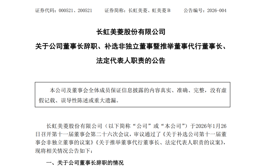 近日,长虹美菱公告表示,原董事长吴定刚因个人工作调整,决定辞去公司董事、董事长及董事会下属各专业委员会全部职务,辞职后不再担任公司任何职务。至此,这位在长虹体系内履职多年的“老将”,正式告别其上市公司董事长角色。