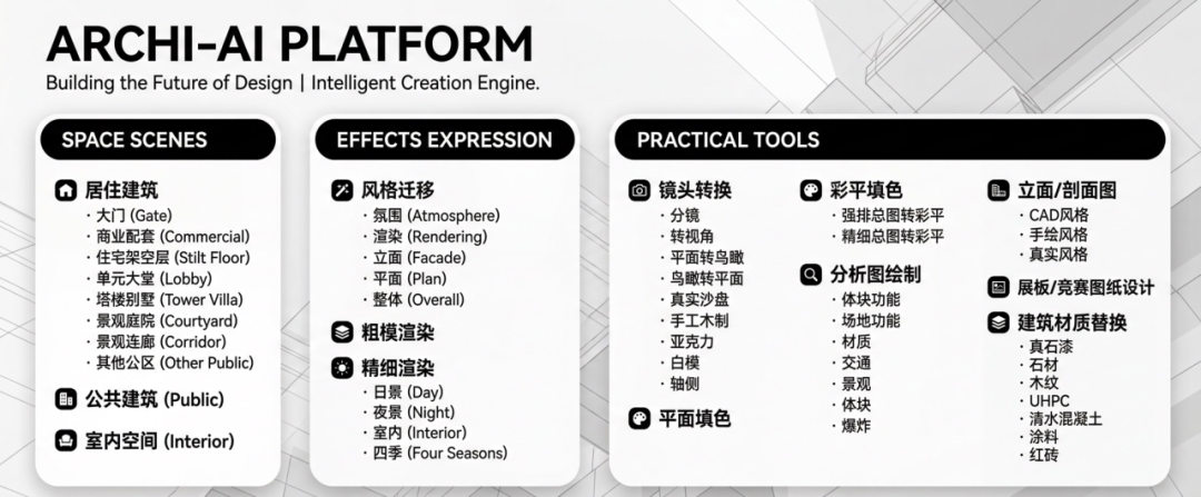 围绕建筑、室内与景观设计的真实工作场景,灵宝 AI 聚焦六个关键能力方向: