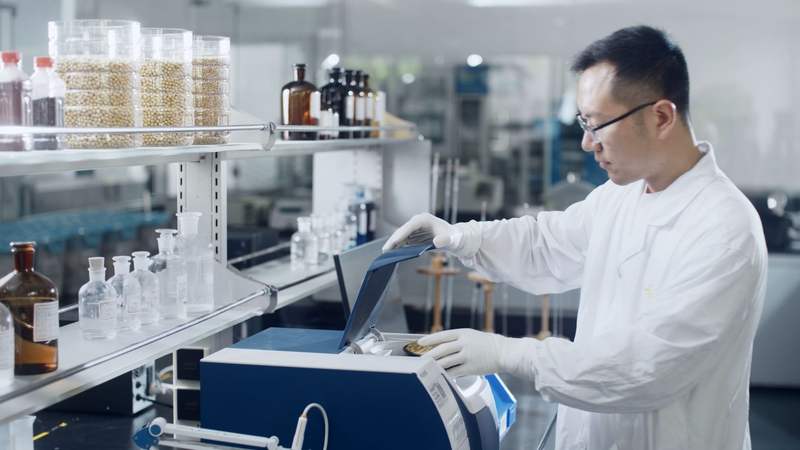 千禾味业技术人员正在实验室为大豆原料进行指标检测。