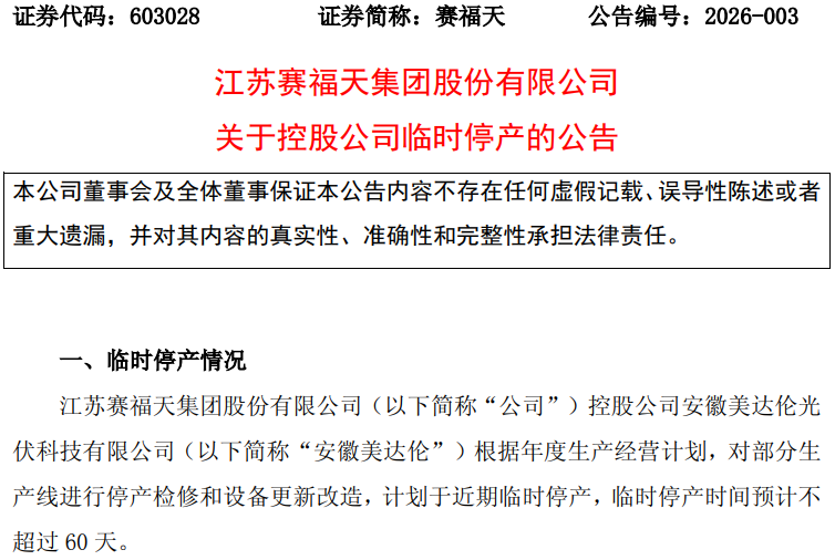 1月29日晚,赛福天(603028)发布公告称,控股公司安徽美达伦光伏科技有限公司(以下简称“安徽美达伦”)计划于近期临时停产,时间不超过60天。主要系该公司对部分生产线进行停产检修和设备更新改造。