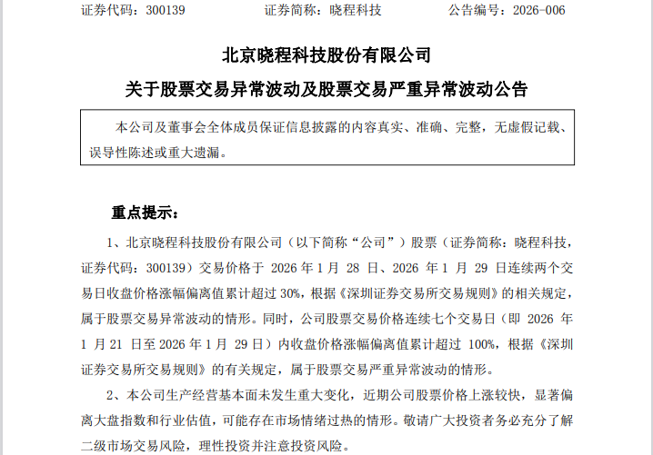 同日,多家券商亦发布交易风险提示公告指出,晓程科技在1月26日、27日连续两个交易日累计涨幅偏离值达到34.34%,属于股票交易异常波动的情况。深交所对晓程科技出现的异常交易行为从严认定,并视情况从重采取列为重点监控账户、暂停投资者账户交易、限制投资者账户交易等自律管理措施。